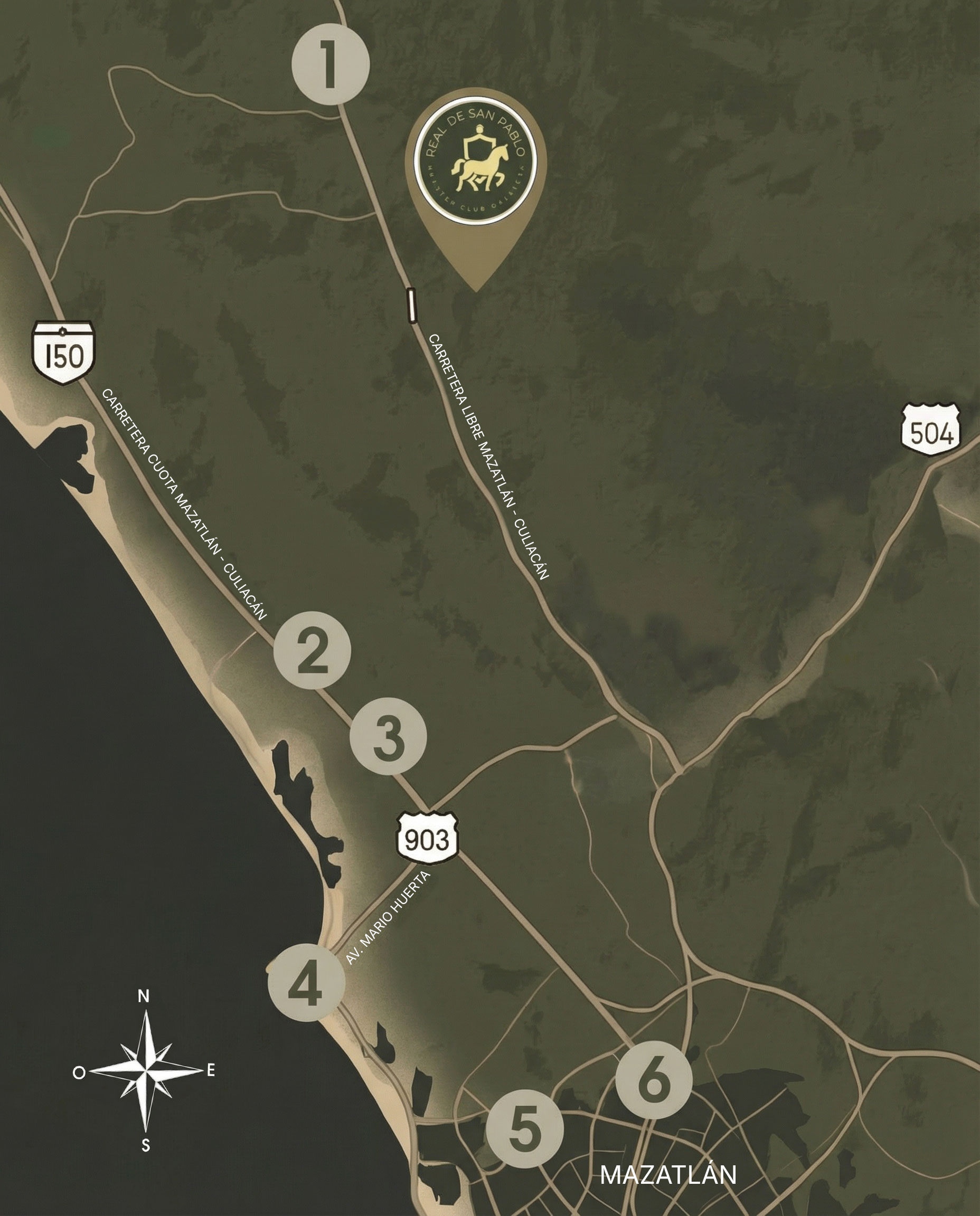 Real de San Pablo se ubica al norte de Mazatlán, dentro de una zona de crecimiento que combina conectividad, naturaleza y tranquilidad. Su ubicación permite disfrutar un entorno campestre con acceso rápido a puntos clave de la ciudad.